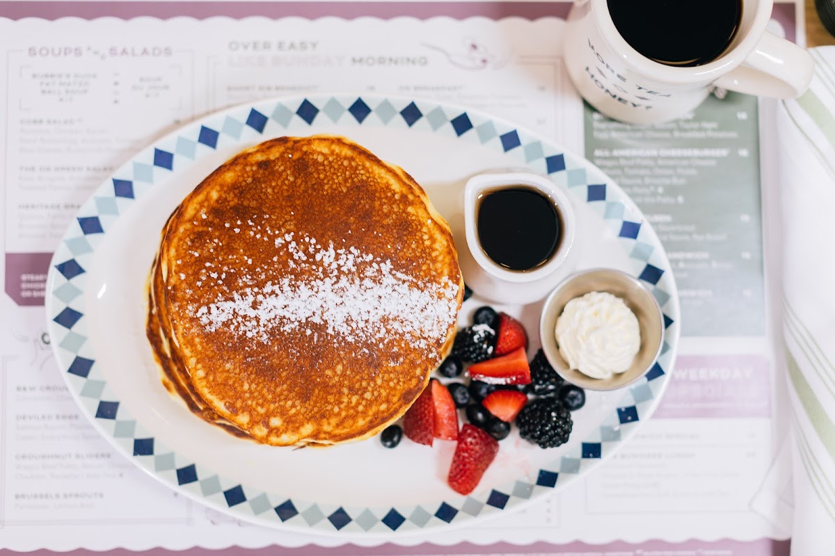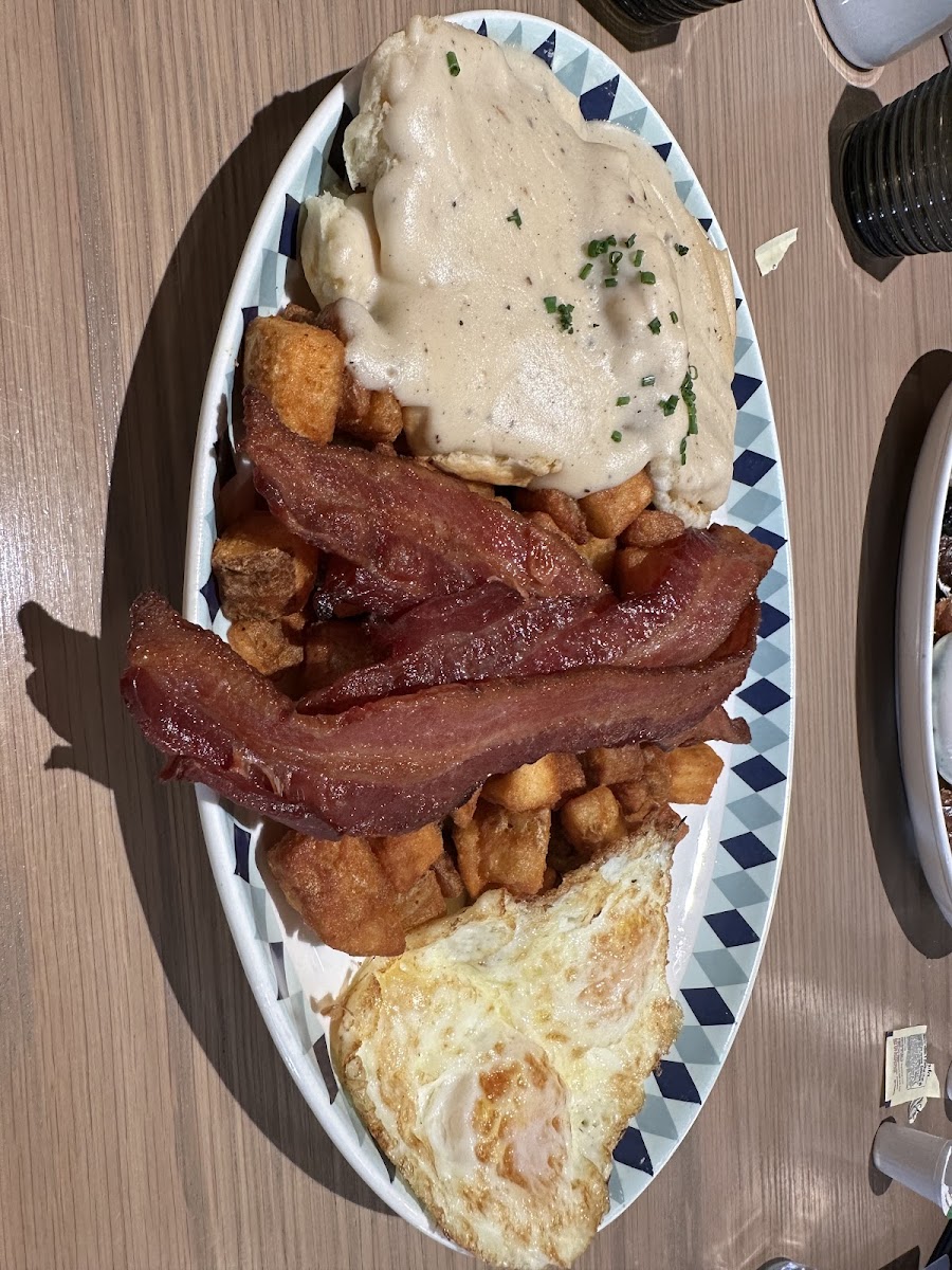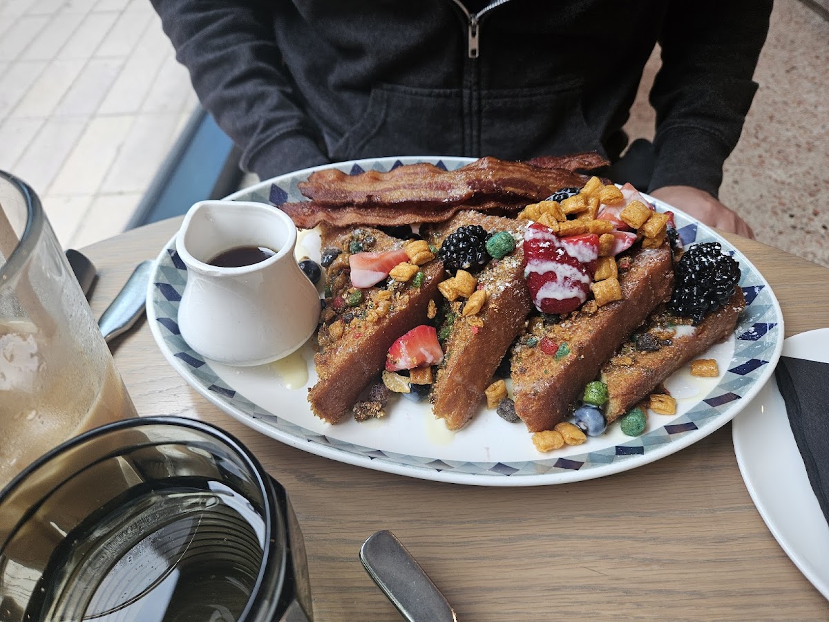We went here for breakfast last weekend. My almost 4 year old found the candy display by the entrance dazzling. He got the kids French toast plate. It was delicious. My husband got the hot honey fried chicken sandwich with an egg on top and it was memorable. I had the veggie egg Benedict and it was sad. Not great flavor and cold. We each got an orange juice as well and it was disappointing-not fresh squeezed (not that it was advertised as such) but definitely tasted of carton. Our server was nice though, and I imagine we'll be back at some point.