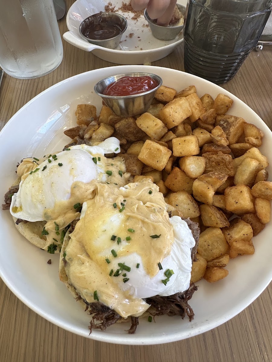 Had never been to this little area before and now I know where they hide the ice skating rink! We came in sort of the back way into the restaurant (not through the hotel) and had to make our way up front to the check in desk. We had made a reservation so we were seated quickly towards the back with a view of the center/courtyard kind of thing. A ton of things looked great on the menu - was tricky to narrow things down. I finally ended up with the "OG breakfast" I think it was, with eggs, potatoes, toast and I liked that one protein choice was avocado (instead of bacon/sausage which I'm not a fan of). I thought the platter was great and absolutely loved the little fried/crispy potatoes almost like small, square French fries (though I do like home fries too). My husband got a green chile benedict and said it was great and unfortunately forgot his to-go box on the table. Our server was attentive and friendly, forgot to catch his name. The bathrooms are kind of inconveniently in the hotel and down the hall (a good 1-2 minute walk from our table) but the hotel entry area and main walkway were really attractive and I loved the weird perpetual motion ball machine thing in the hallway. Overall a great brunch with friends and would definitely come back again.